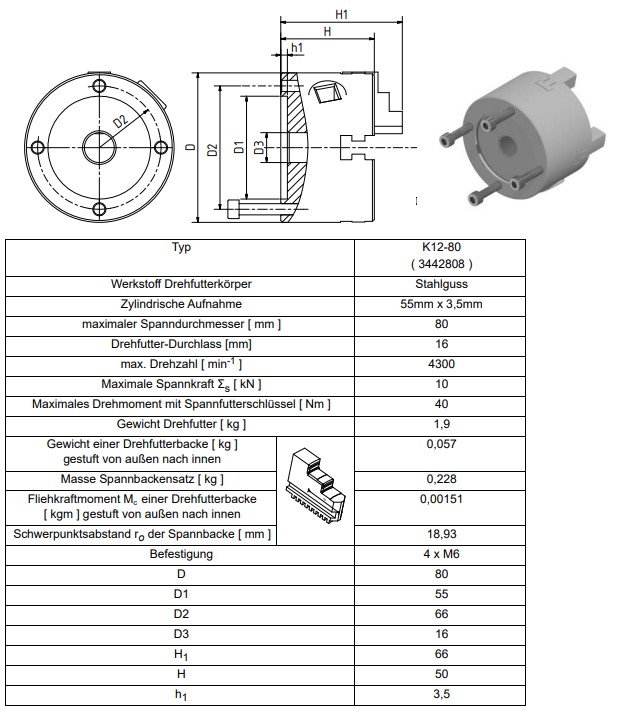 Optimum 4-Backendrehfutter Guss, zentrisch spannend D=80 mm DIN 6350